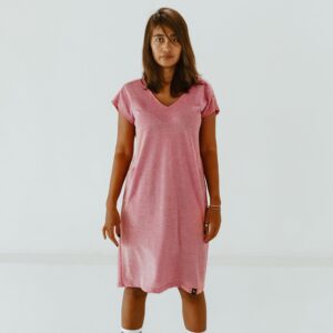 Duurzaam gemaakte jurk met 3/4 mouw, lang model tot op de knie/over de knie met ceintuur, gemaakt van afgedankte stof.