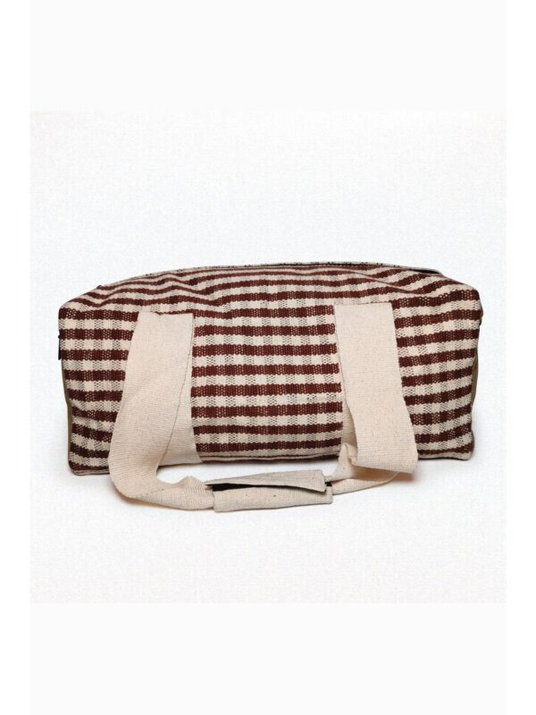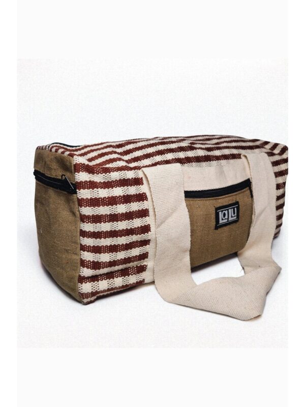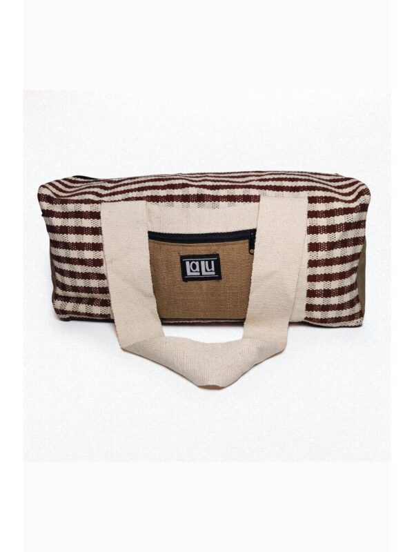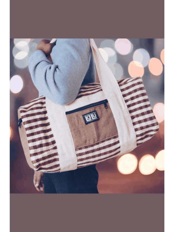 Chandre Sand is an extra large duffle bag made of organic cotton. The fabric is woven by hand, which makes the design and colors of each bag unique! The bag has an extra pocket on each side and each pocket can be closed with a high quality zipper. The straps of the bags can be tight together with a handy velcro system. On the front side there is an extra slide in pocket. The inside of the bag is covered with extra layers of cotton. This makes the bag sturdy and water resistant. The size of the bag makes it perfect to take with you to the gym, a day out or even on a several day trip!