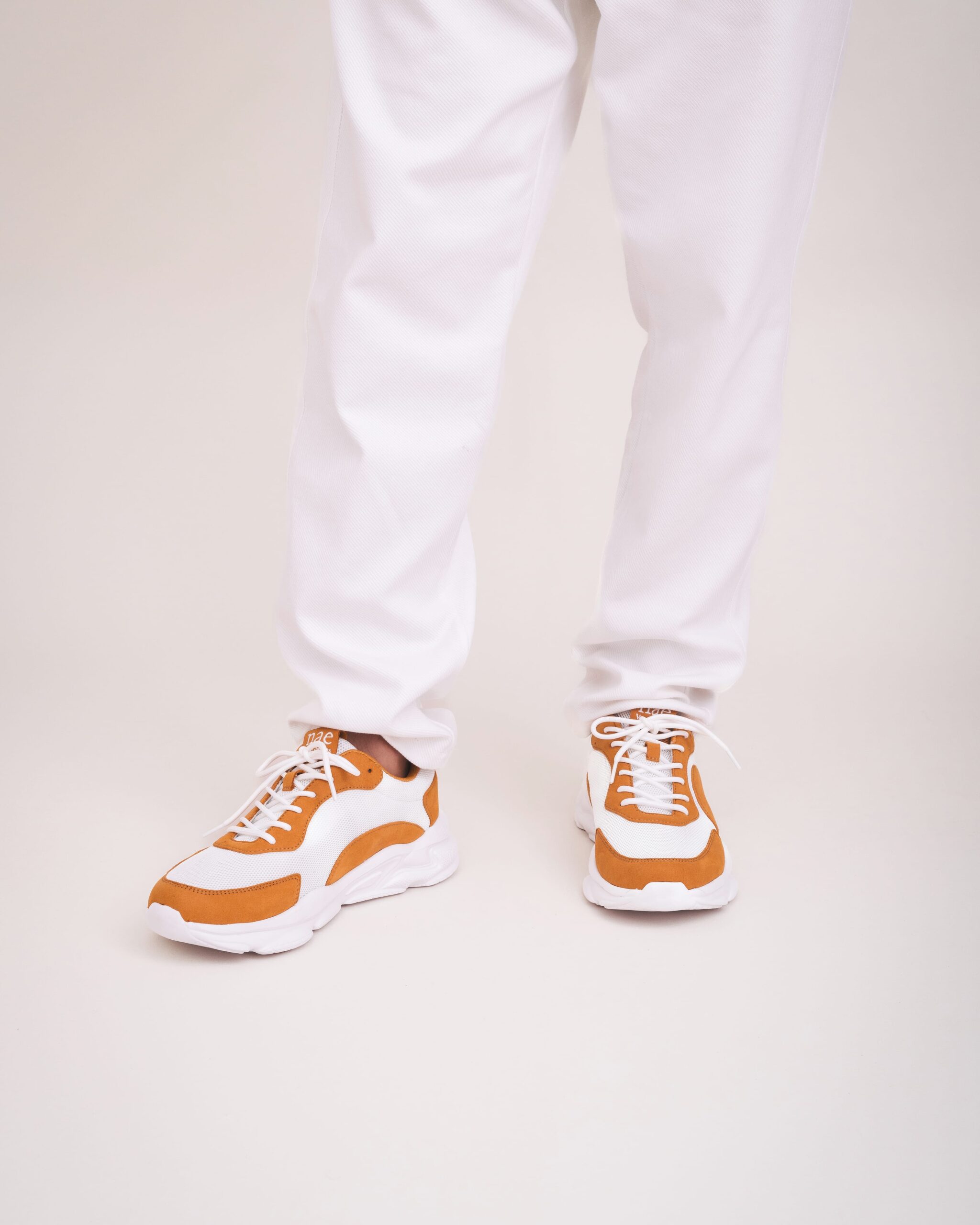 Unisex vegan sneakers made from breathable GRS-certified recycled PET mesh in a bright white base, complemented by warm toasted-yellow vegan microsuede overlays and matching branding details. Dan blends a sporty, running-inspired silhouette with lightweight athleisure comfort, offering soft cushioning and flexibility through its EVA sole. A warm, vibrant colourway designed for everyday movement.