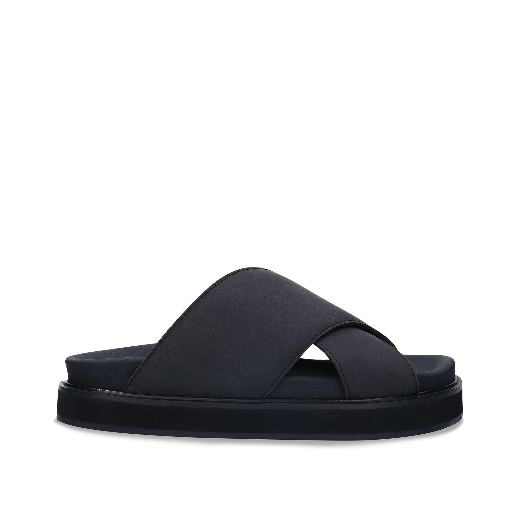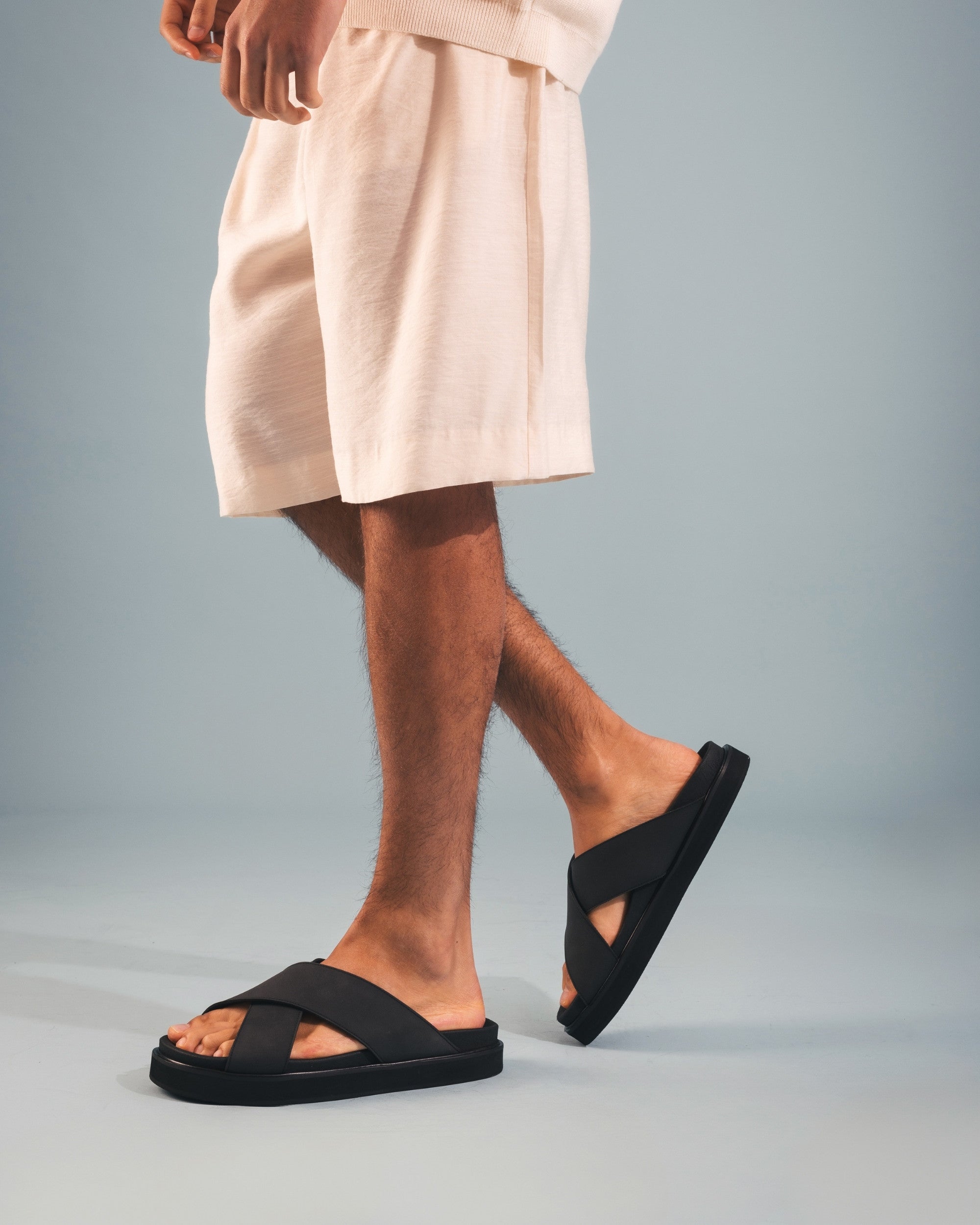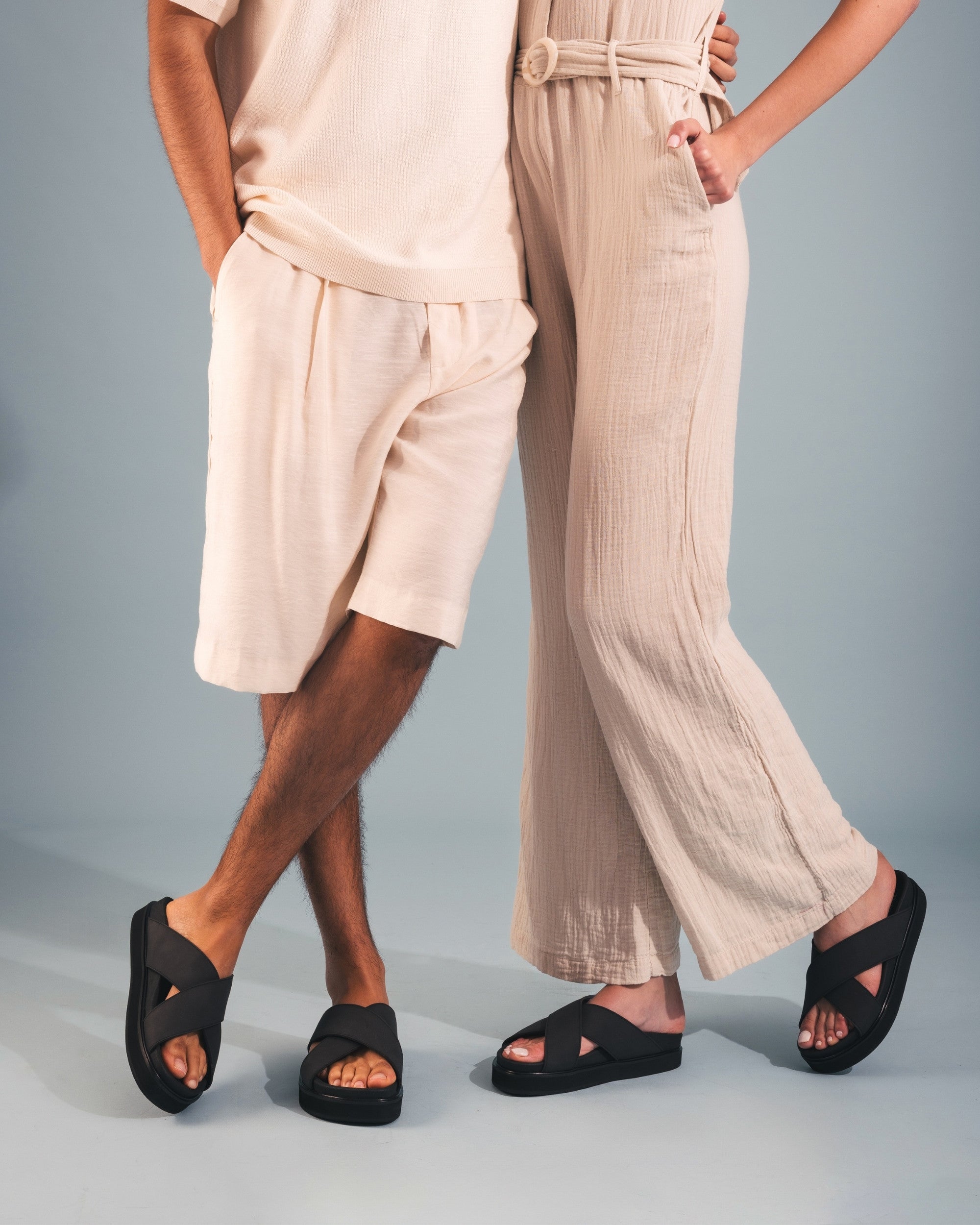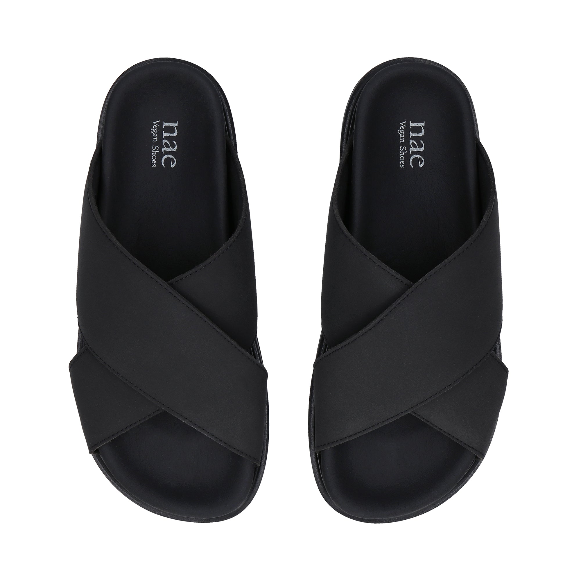 Davu Black vegan sandals are handcrafted in Portugal with eco-friendly microfibers. Featuring a bold criss-cross design at the upper (each strap approximately 4.5 cm wide at the front, widening up to 7 cm at the back), a 2 cm platform, and a 1 cm sole, these slip-ons offer contemporary style and comfort.