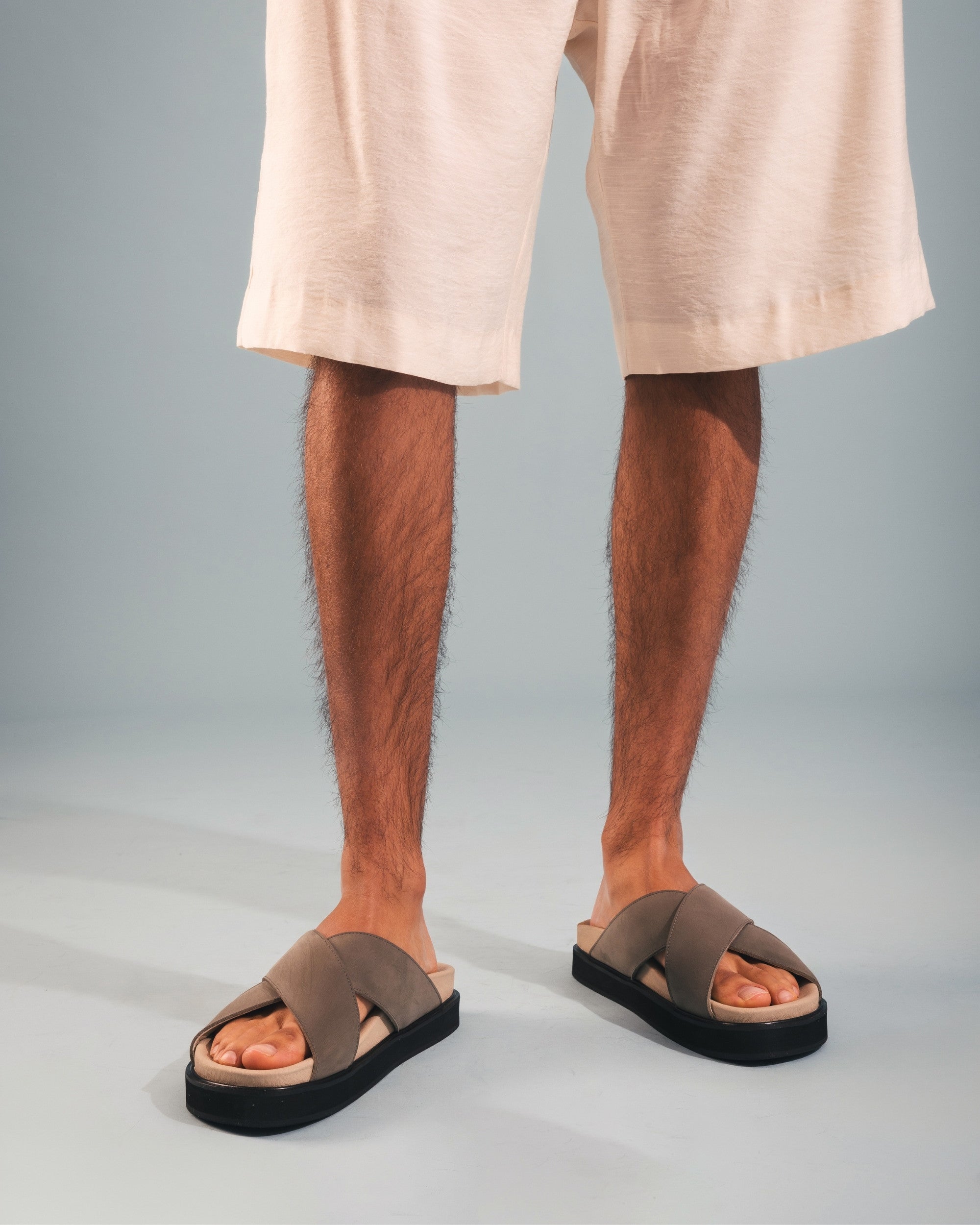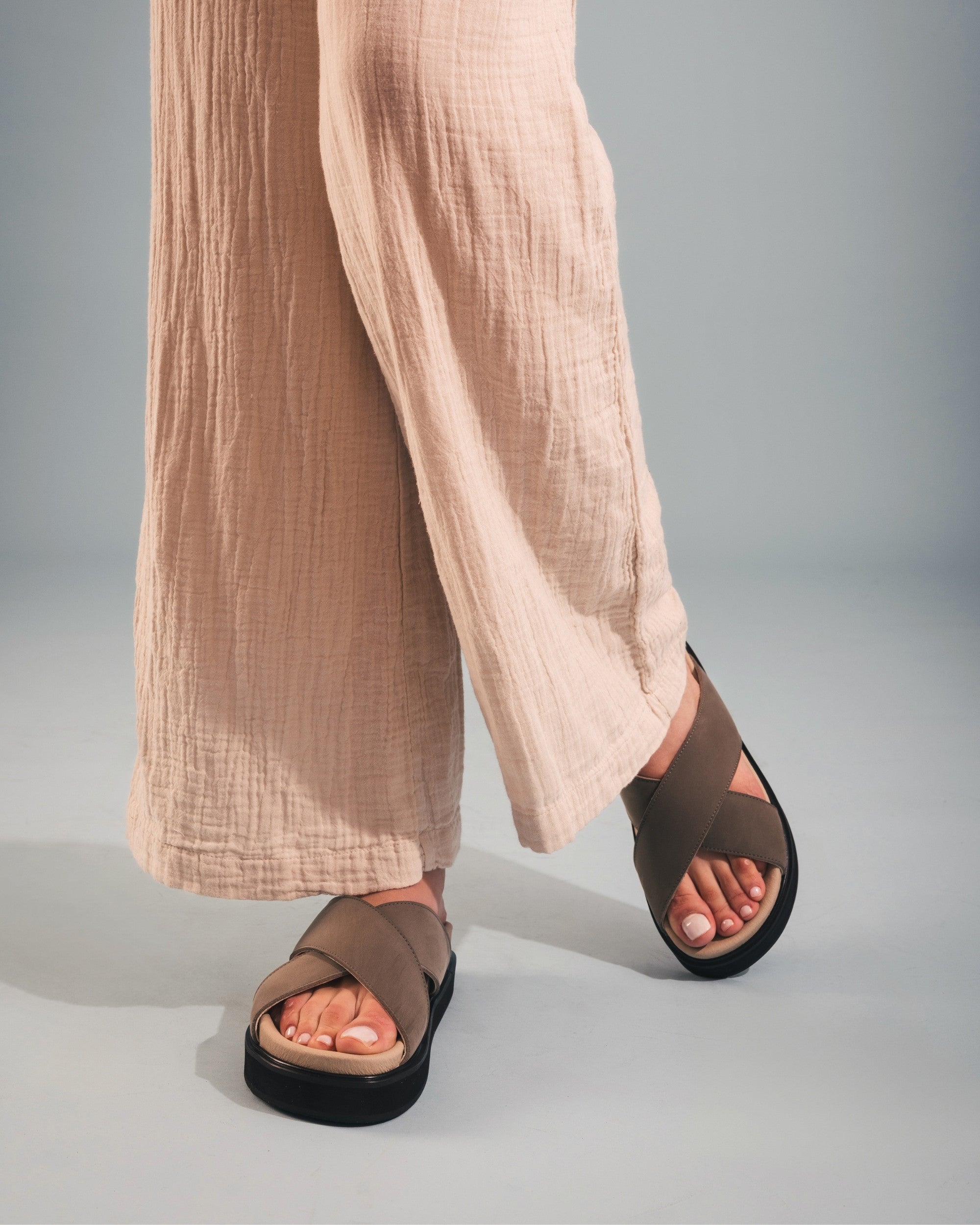 Davu Green vegan sandals are handcrafted in Portugal with eco-friendly microfibers. Featuring a bold criss-cross design at the upper (each strap approximately 4.5 cm wide at the front, widening up to 7 cm at the back), a 2 cm platform, and a 1 cm sole, these slip-ons offer contemporary style and comfort.