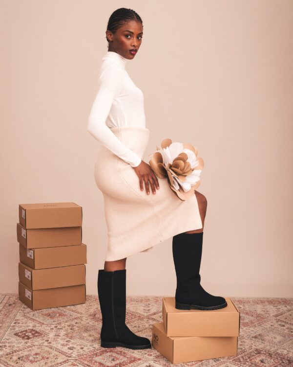 Irem is a tall and sleek vegan knee-high boot with a side zipper for ease. Crafted in Portugal from black vegan suede with soft OnSteam lining. Elegant, versatile, and perfect for everyday cold-weather wear.