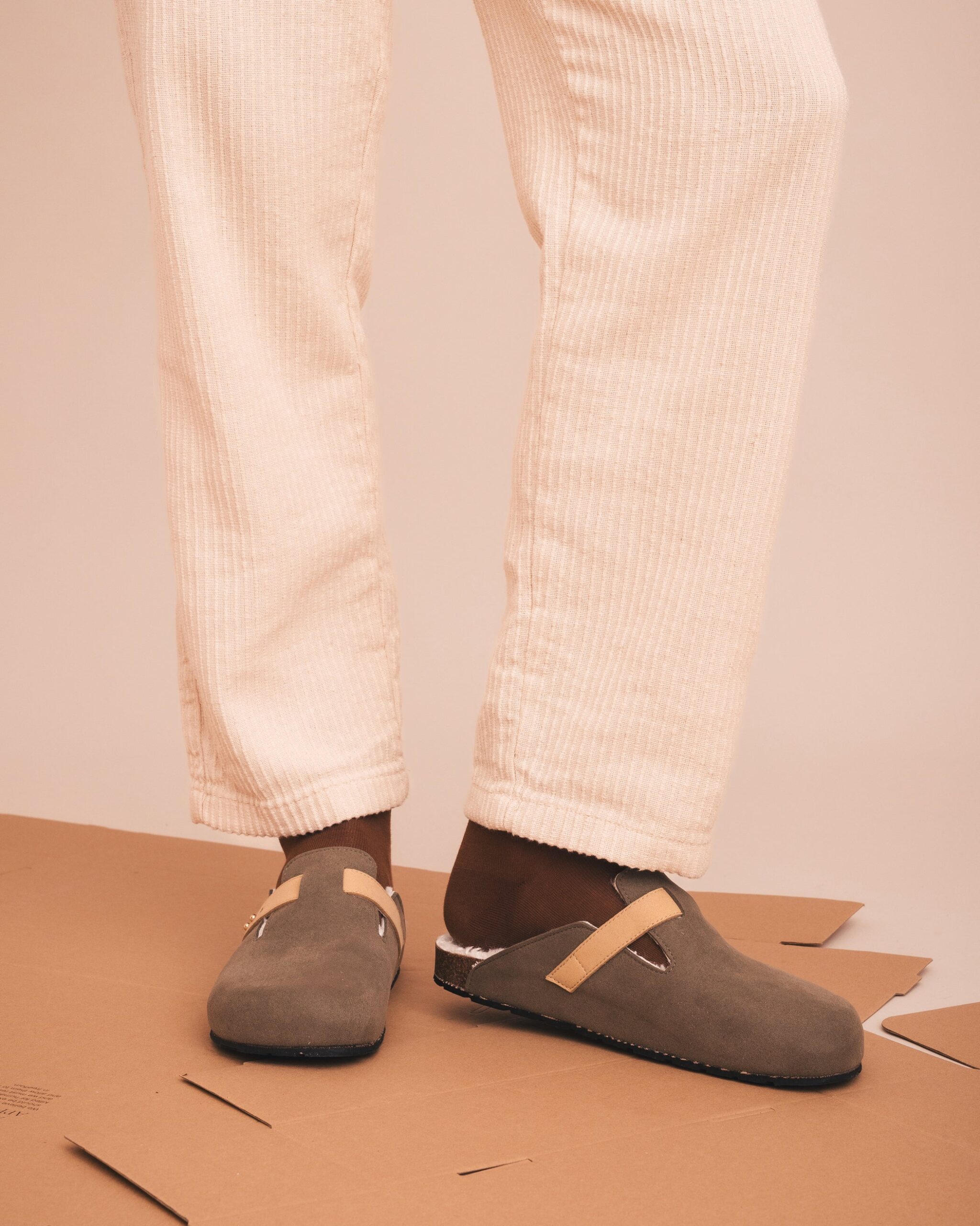 Levu is a pair of vegan sandals with a soft microsuede upper, plush organic cotton lining, and an adjustable strap with metal pins. Designed for comfort, they feature a natural cork insole and a recycled rubber sole made from car tires. Perfect for relaxing at home or everyday wear.