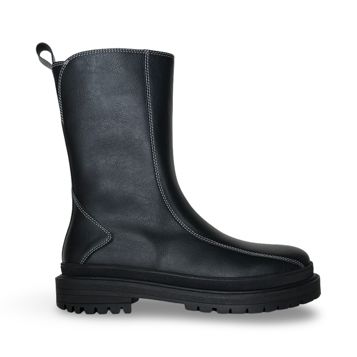 Reiko is a mid-calf vegan boot with a chunky sole, bold contrast stitching, and an inner zipper for comfort. Crafted from OnCross and handmade in Portugal with ethical precision.