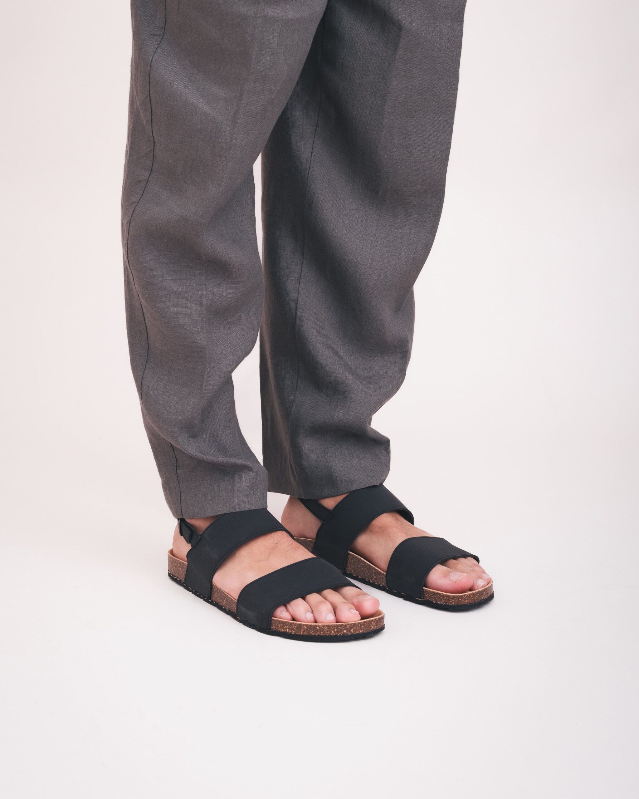 Savai Black is a minimalist vegan sandal made in Spain, designed for everyday comfort and conscious living. Crafted with a vegan nubuck-like upper, a natural cork insole, and a durable outsole made from recycled car tyres, it offers stability, softness, and long-lasting wear. Featuring two front straps and a back strap with buckle closure, Savai provides a secure fit with a clean, timeless silhouette.