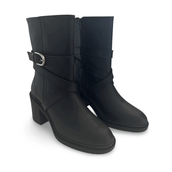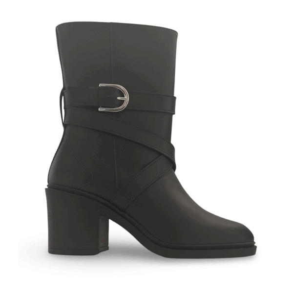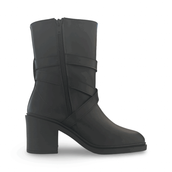 Tulai is a mid-calf women’s vegan boot with a block heel, side zip, and decorative strap detail. Crafted in Portugal using OnMicro Pure and lined with OnSteam, it balances bold styling with comfort and ethical materials. Designed for everyday wear with a fashion-forward edge.