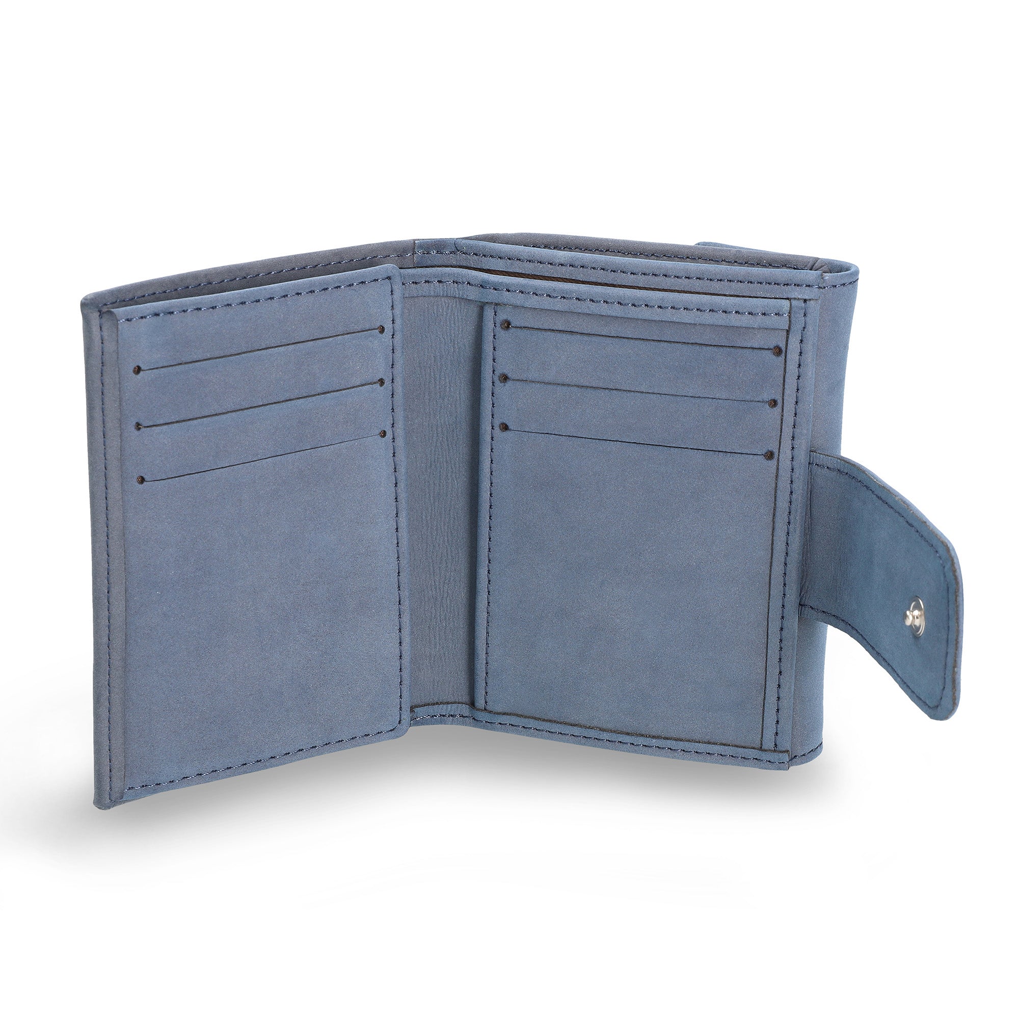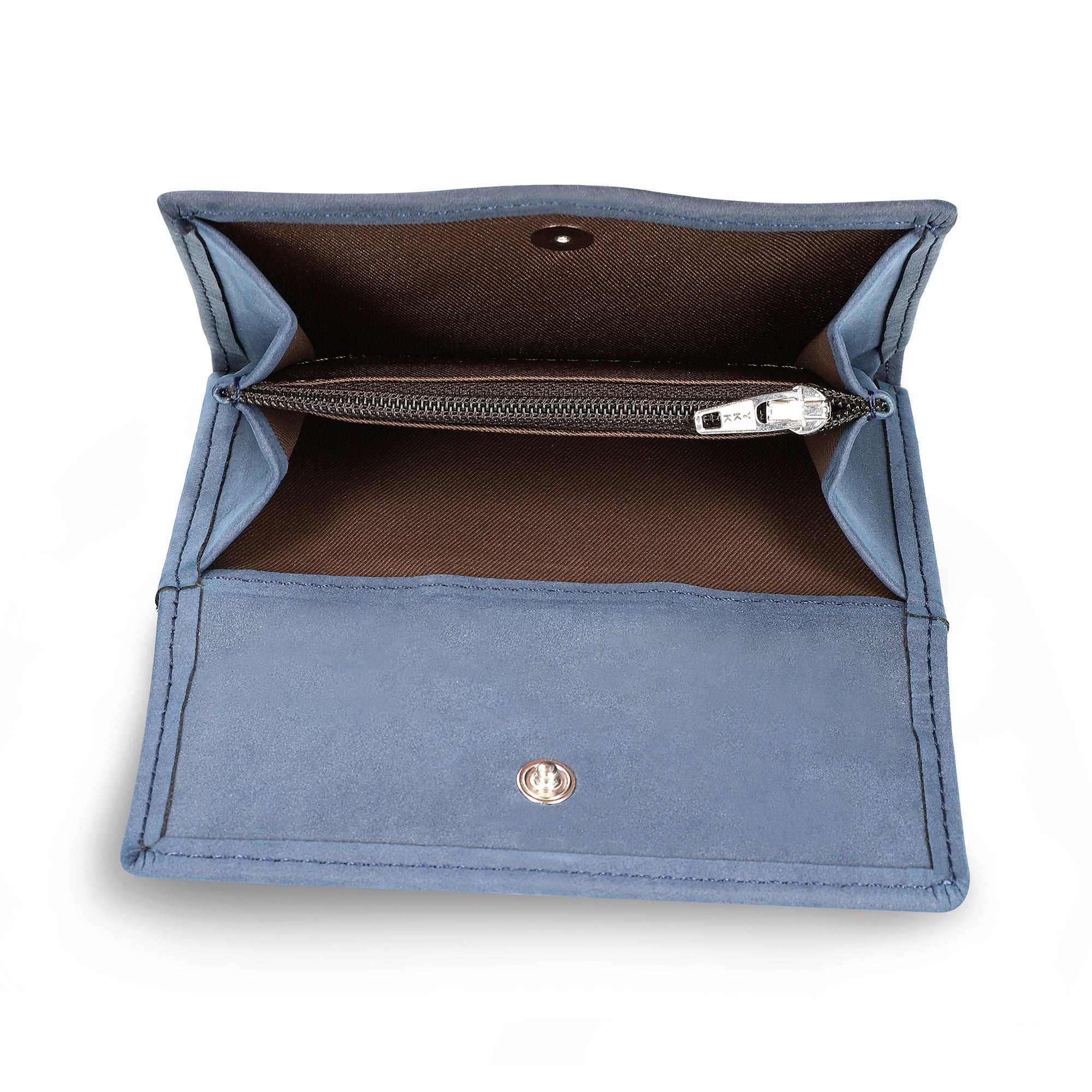 Vene Blue: the women’s wallet with popper fastening, flap button with zip section coin purse, card and notes compartments, crafted from vegan nubuk